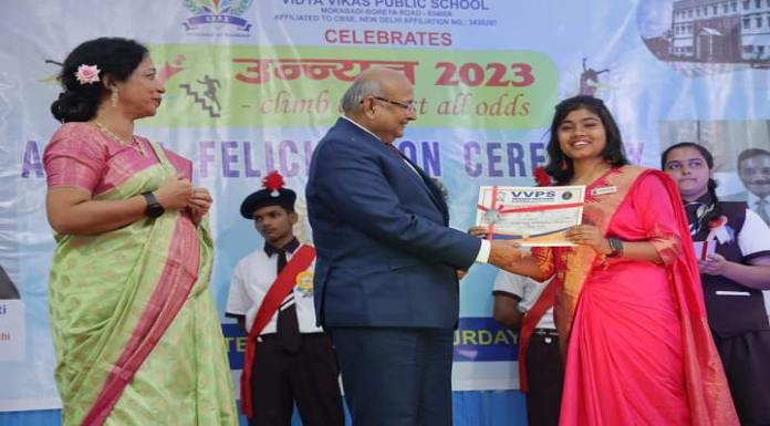रांंची: विद्या विकास पब्लिक स्कूल में शनिवार को वार्षिक पुरस्कार वितरण समारोह “उन्नयन 2023” का आयोजन हुआ। जिसमें पिछले सत्र के सफल शैक्षणिक टॉपर्स को सम्मानित किया गया।