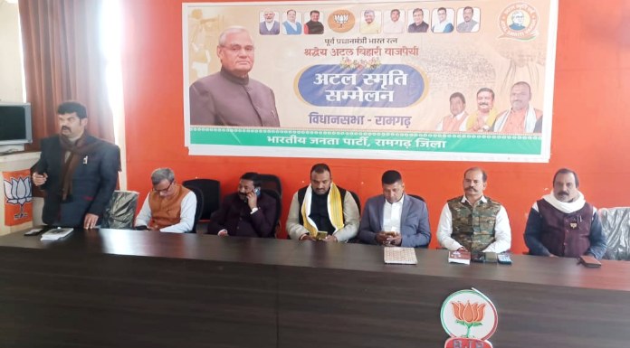 रामगढ़: भाजपा जिला कार्यालय में सोमवार को रामगढ़ विधानसभा स्तरीय अटल बिहारी स्मृति सम्मेलन जिला अध्यक्ष प्रवीण मेहता की अध्यक्षता में संपन्न हुआ। सम्मेलन में बतौर मुख्य अतिथि ओबीसी मोर्चा के प्रदेश अध्यक्ष अमरदीप यादव शामिल हुए। कार्यक्रम का शुभारंभ दीप प्रज्वलन और डॉ श्यामा प्रसाद मुखर्जी, दीनदयाल उपाध्याय एवं अटल बिहारी वाजपेयी के चित्र पर माल्यार्पण कर किया गया।