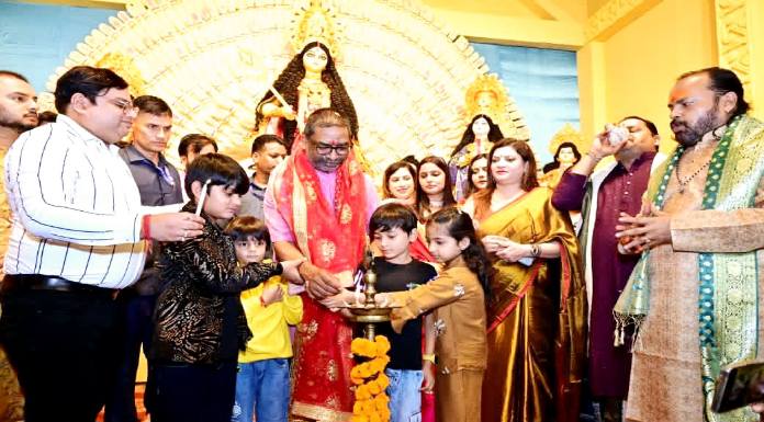 रांची: शारदीय नवरात्र के पावन अवसर पर मां दुर्गा की पूजा भक्तिभाव और हर्षोल्लास के साथ हो रही है। राजधानी रांची में जगह-जगह भव्य पंडाल बनाए गए हैं। कई जगहों पर पंडाल का निर्माण और साज-सज्जा अंतिम चरण में हैं। इधर, सूबे के मुख्यमंत्री हेमंत सोरेन ने शुक्रवार की शाम पूजा पंडालों का विधिवत उद्घाटन किया और मां दुर्गा की प्रतिमा के समक्ष नतमस्तक होकर मंगलकामना की। मुख्यमंत्री ने पंच मंदिर दुर्गा पूजा समिति हरमू और आर.आर. स्पोर्टिंग कल्ब रातू रोड के पंडाल का फीता काटकर और दीप प्रज्जवलित कर उद्घाटन किया।इससे पूर्व पूजा समिति के पदाधिकारियों और श्रद्धालुओं ने उनका स्वागत किया। मुख्यमंत्री ने मां दुर्गा की प्रतिमा के समक्ष नतमस्तक होकर आशीर्वाद लिया और मंगलकामना की। वहीं उन्होंने श्रद्धालुओं को दुर्गा पूजा की शुभकामनाएं दीं।