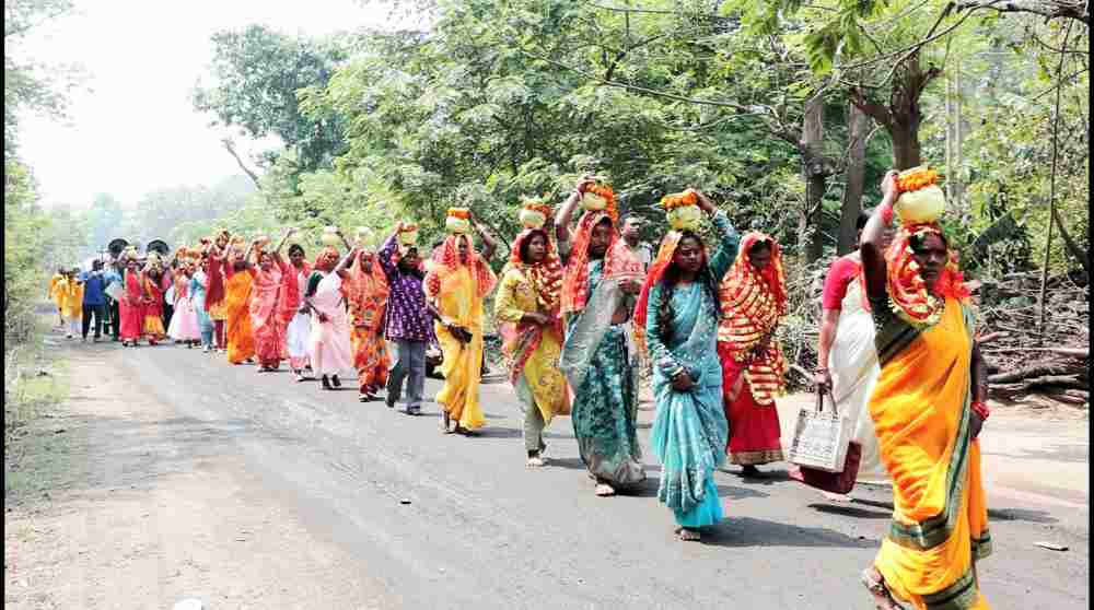 इस दौरान जय मां काली के उद्घोष से क्षेत्र गूंजायमान रहा। वहीं कलश यात्रा वापस पहुंचने पर मंदिर में कलशों को स्थापित किया गया और विधि-विधान से पूजा-अर्चना शुरू की गई। यजमान के रूप में झारखंड मुक्ति मोर्चा जिला संगठन सचिव सह विस्थापित नेता गणेश गंझू सपत्नीक शामिल हुए।