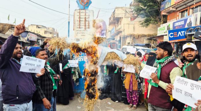 रांची: पिठौरिया अंबेडकर चौक पर रविवार को राजनीतिक दल AIMIM ने बिहार के मुख्यमंत्री नीतीश कुमार का पुतला दहन किया। इस दौरान महिला के चेहरे से हिजाब हटाने के प्रकरण को लेकर नाराजगी जताई गई। साथ ही शांतिपूर्ण तरीके से विरोध प्रदर्शन किया गया। कार्यक्रम की अध्यक्षता कांके प्रखंड अध्यक्ष हबीबुल अंसारी और संचालन प्रखंड संयोजक अख्तर रज़ा ने किया।