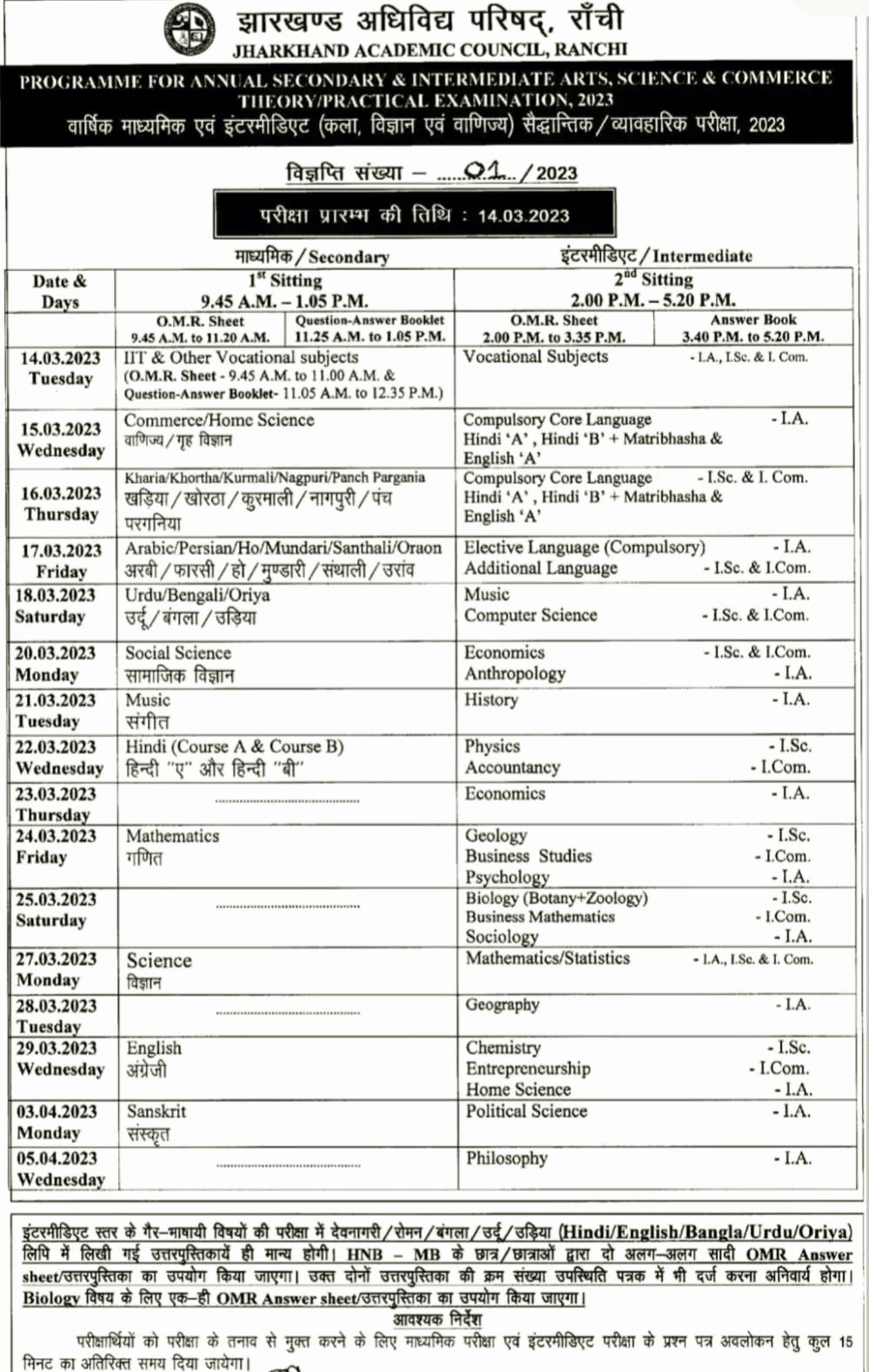 Ranchi: झारखंड एकेडमिक काउंसिल (JAC) ने 10वीं और 12वीं की परीक्षा की डेटशीट जारी कर दी है। मैट्रिक की परीक्षा 14 मार्च से शुरू होकर तीन अप्रैल तक चलेगी। JAC 12वीं की परीक्षा आगामी 14 मार्च से शुरू होगी और पांच अप्रैल को समाप्त होगी। फरवरी माह में परीक्षा का एडमिट कार्ड जारी किया जाएगा।