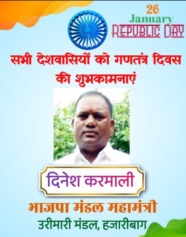 बड़कागांव: भारतीय जनता पार्टी उरीमारी कार्यालय में गणतंत्र दिवस धूमधाम से मनाया गया। सर्वप्रथम भाजपा उरीमारी मंडल, बड़कागांव पूर्वी महामंत्री दिनेश करमाली के द्वारा पार्टी कार्यालय में झंडोतोलन किया गया। तत्पश्चात तिरंगे को सलामी दी गई।