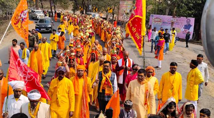 रामगढ़: पंचायत कटिया बस्ती पतरातू के गरेवाटांड़ में श्री श्री 1008 रुद्र महायज्ञ सह शिव प्राण प्रतिष्ठा सोमवार को कलश यात्रा के साथ आरंभ हुआ। कलश पूजन के उपरांत हर हर महादेव जयकारे के बीच गाजे-बाजे के साथ कलश यात्रा निकली गई। जिसमे बड़कागांव विधायक रोशन लाल चौधरी समेत बड़ी संख्या में महिला पुरुष श्रद्धालु शामिल हुए। यज्ञ स्थल से आरंभ हुई कलश यात्रा बिरसा मार्केट होते हुए पंच बाहिनी मंदिर नलकारी नदी तट पहुंची। जहां वैदिक मंत्रोच्चार के बीच श्रद्धालुओं ने कलश में जल भरा। यहां से कलश यात्रा सरस्वती शिशु मंदिर स्कूल होते हुए वापस यज्ञ स्थल पहुंची। जहां कलशों को स्थापित किया गया। अवसर पर विधायक रोशन लाल चौधरी ने कहा कि ऐसे धार्मिक आयोजनों से समाज में शांति, एकता और सकारात्मक ऊर्जा का संचार होता है।