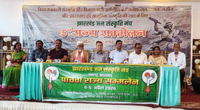 रामगढ़: झारखंड जन संस्कृति मंच का दो दिवसीय राज्य सम्मेलन शनिवार को कुजू नया मोड़ स्थित अक्षत बैंक्वेट हॉल में आयोजित किया गया। जिसमें राज्य के विभिन्न जिलों से आए साहित्यकार, लोक कलाकार और बुद्धिजीवियों ने भाग लिया। सम्मेलन का उद्घाटन डॉक्यूमेंट्री फिल्म मेकर मेघनाथ ने किया। उद्घाटन सत्र की अध्यक्षता पत्रकार जावेद इस्लाम और संचालन मंच के राज्य सचिव कवि बलभद्र ने किया। वहीं स्वागत संबोधन लेखक और गायक सुरेंद्र कुमार बेदिया के द्वारा किया गया। सम्मेलन के आरंभिक सत्र में वक्ताओं ने वर्तमान परिप्रेक्ष्य में संस्कृति पर अपने वक्तव्य दिए। जबकि दूसरे सत्र में झारखंड संस्कृति मंच के कलाकारों ने गीत-संगीत और नृत्य पर आधारित प्रस्तुति दी।